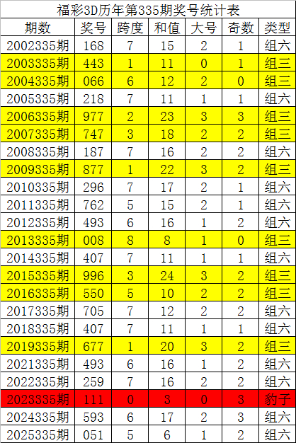 从以上统计不错看出,积年3D第336期开出了5次组三号码,开出了17次组六号码。组六号码出现概率大,本期预测开出组六号码。