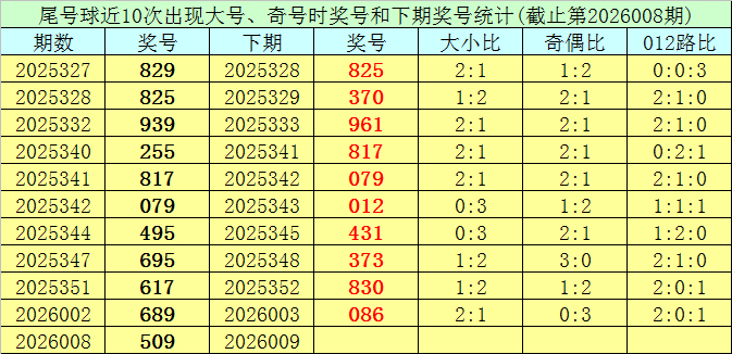在尾号球前10次开出大号、奇号类型之后,其下期辞别开出奖号:825、370、961、817、079、012、431、373、830、086,其中号码奇偶比为6:4,大小比为4:6,012路比为5:3:2。