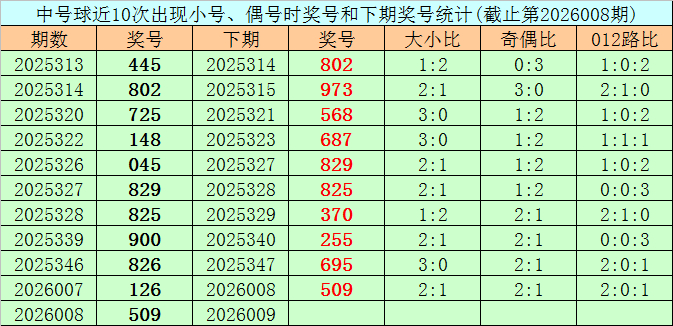 中号球:上期奖号为0,开出小 号、偶号,该位前10次开出小 号、偶号的气候时其奖号辞别为:445、802、725、148、045、829、825、900、826、126,其中中号球012路比为2:3:5。