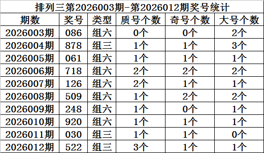 上期追忆:成列三第2026012期开奖:522,质合比为3:0,奇偶比为1:2,大小比为1:2。